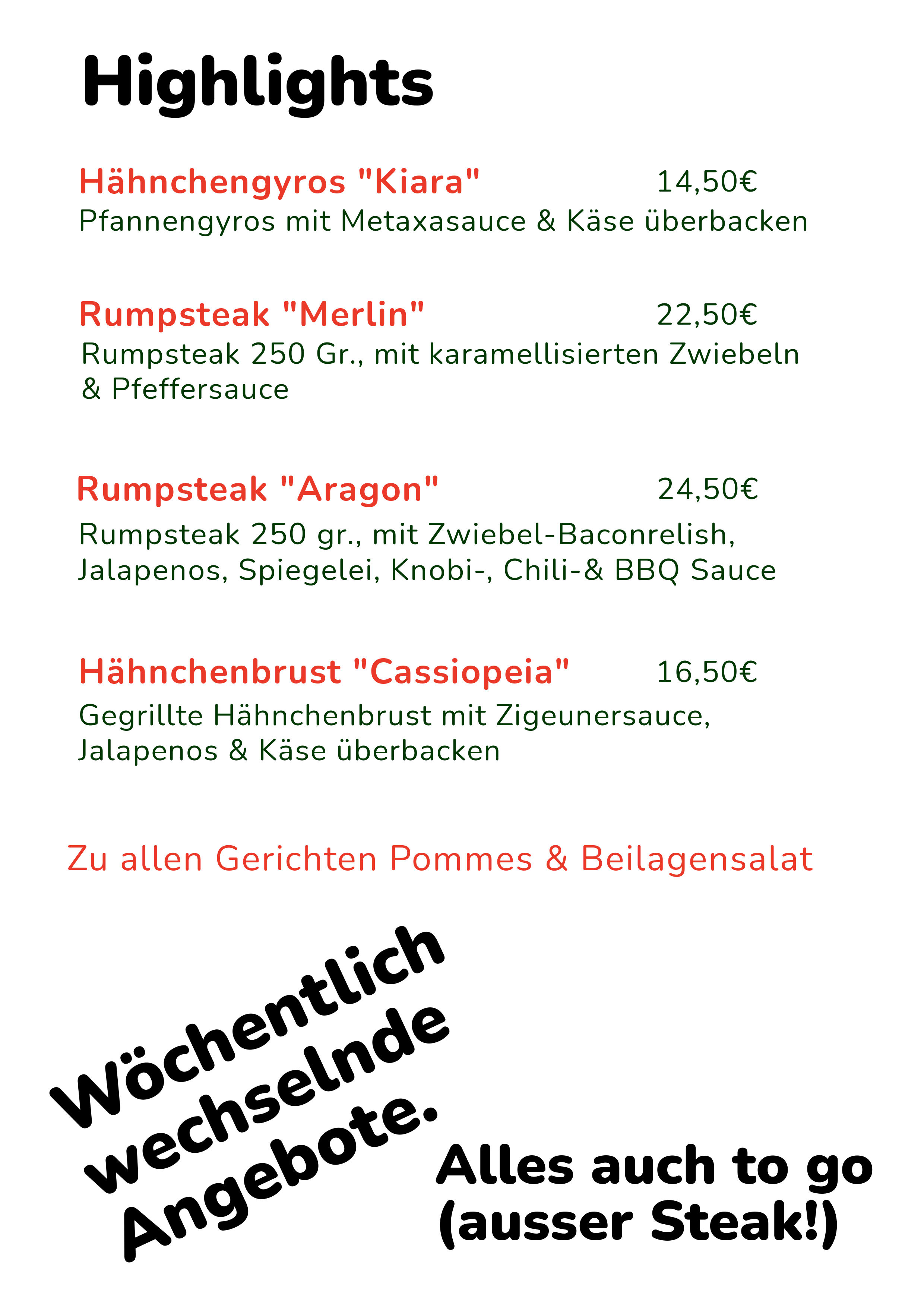 Wochenangebote, immer frische Zutaten, kaltes Bier, nette Menschen, rockige Mucke!